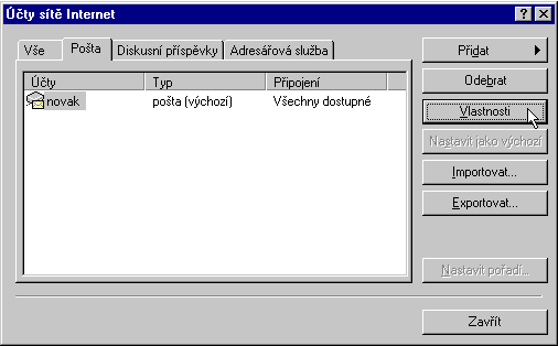 Na záložce "Pošta" označte název účtu, který chcete nastavit. Pak klikněte na ikonu "Vlastnosti".