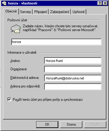 Na záložce "Obecné" do pole "Elektronická adresa" vepište vaši emailovou adresu - např. HonzaRuml@dobruska.net (tuto informaci najdete na vaší smlouvě s Dobruška.net).