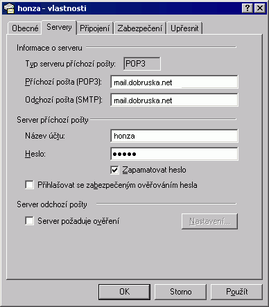 Přejděte na druhou kartu "Servery". V oddíle "Informace o serveru" do pole "Příchozí pošta (POP3)" vepište mail.dobruska.net a do následujícího pole "Odesílaná pošta (SMTP)" pak mail.dobruska.net