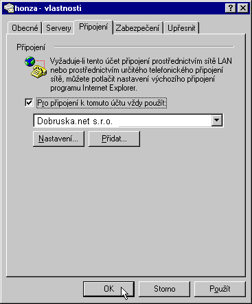 Na třetí záložce "Připojení" si vyberte telefonické připojení - zpravidla Dobruška.net s.r.o.. Nyní vše potvrďte tlačítkem "OK" a následně tlačítkem "Zavřít".