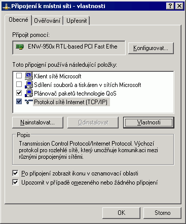 Klepněte na tlačítko Start, nabídka Ovládací panely, ikona Síťová připojení. Zde klepněte pravým tlačítkem myši na připojení k síti, které používáte pro internet. Nejčastěji má název Připojení k místní síti. Vyberte položku Vlastnosti. V dialogovém okně Klepněte na název Protokol sítě internet (TCP/IP) a na tlačítko Vlastnosti.