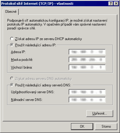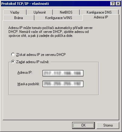 Zde vyplňte části Adresa IP, Maska podsítě, Výchozí brána a DNS servery podle údajů, které máte v konfiguračních datech. Použijte údaje zadané pod hlavičkou Poskytovatel.