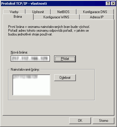 Vyberte záložku Brána, zadejte adresu výchozí brány do kolonky Nová brána a klepněte na tlačítko Přidat. Nově zadaná brána by se vám měla objevit v kolonce Nainstalované brány.