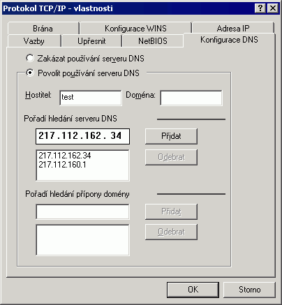 Na záložce Konfigurace DNS zadejte libovolný název do položky Hostitel a zadejte adresy DNS serverů přes tlačítko Přidat.