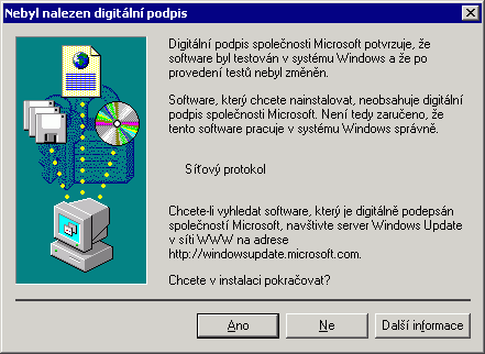 Pravděpodobně se několikrát objeví upozornění, že instalovaný software neobsahuje digitální podpis. Potvrďte instalaci kliknutím na tlačítko Ano.