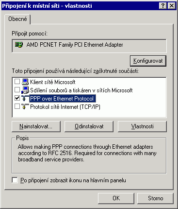 V dialogu Připojení k místní síti - vlastnosti přibude protokol PPP over Ethernet Protocol. Zrušte zaškrtnutí ostatních položek a stiskněte tlačítko OK.