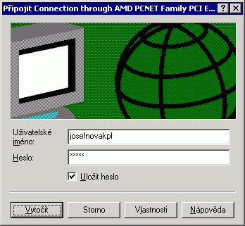 V dialogu Připojit vyplňte přihlašovací údaje. Pokud chcete, aby si systém Windows zapamatoval heslo, zaškrtněte Uložit heslo. Tlačítkem Vytočit spusťte připojení k internetu.