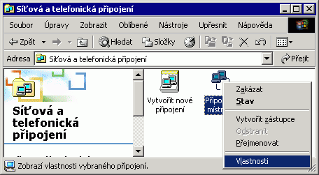 Zde uvidíte ikony síťových připojení. Klikněte na tu, přes kterou jste připojeni (nejčastěji pojmenována Připojení k místní síti) a vyberte nabídku Vlastnosti.