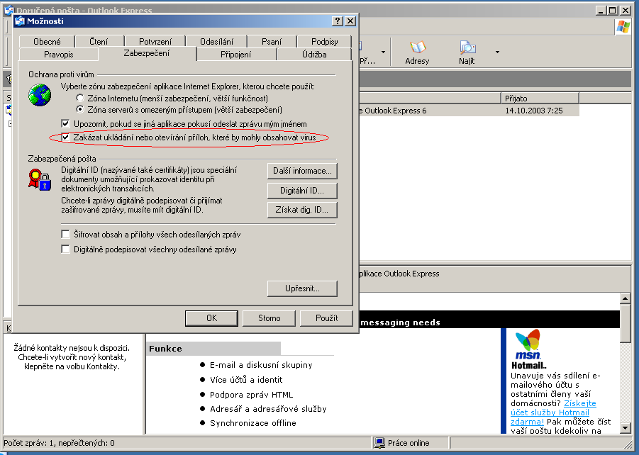 V programu Outlook je implicitně zakázán přístup k některým potenciálně nebezpečným přílohám, které by mohly nést virus a ohrozit tak bezpečnost počítače.